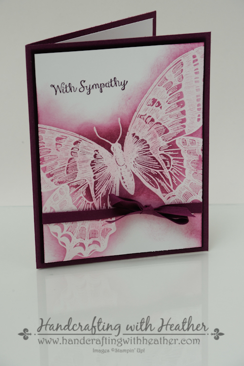 Swallowtail Sympathy Card (4 of 5)I used the resist technique to sponge over my embossed design with Rich Razzleberry ink.  Then I wiped the embossed image with a paper towel to remove the ink that had stuck to the embossing.  Next, I stamped the “With Sympathy” sentiment from the Bloom with Hope stamp set (hostess reward) in Blackberry Bliss ink.
