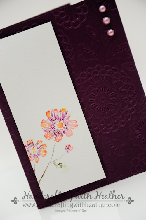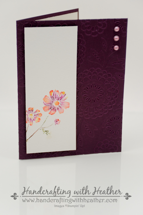 After I painted the flowers and leaves, I dry embossed the card base using the Lovely Lace embossing folder.  Then I added some pearls that I colored using my Rich Razzleberry Stampin’ Blendabilities.