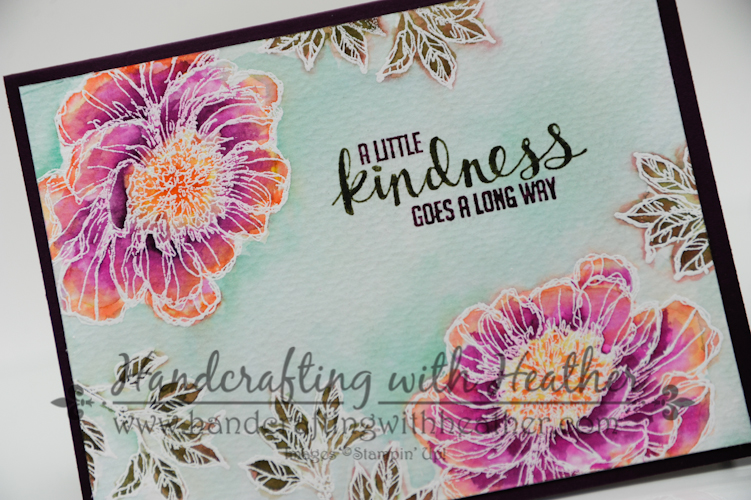 After I painted the flowers and leaves, I added a wash to the background.  First, I painted the whole background with water, then I painted it with a diluted ink solution.  After allowing everything to dry, I added the sentiment from the Kinda Eclectic stamp set from Stampin’ Up!