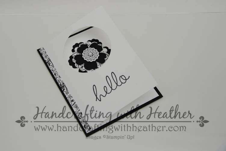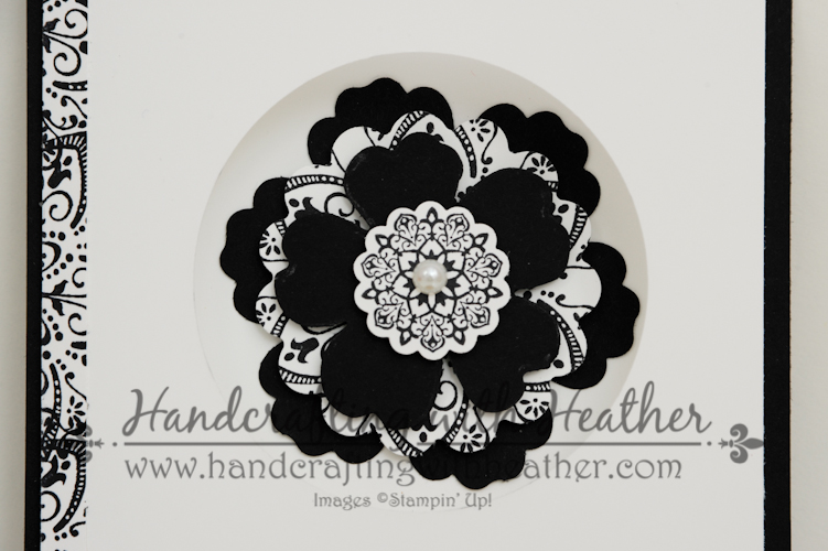 I used the 2-1/2″ circle punch to create a hole in the front of the card, and then glued this beautiful black and white flower to the inside of the card.  The flower features the following elements: