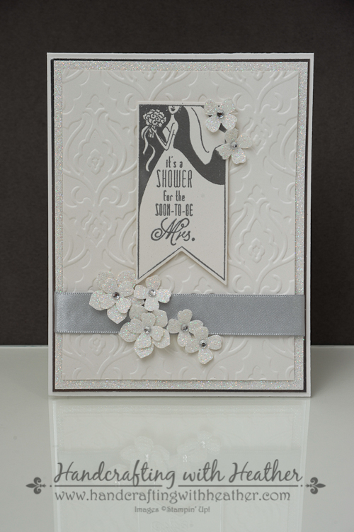 I dry embossed a panel of Shimmery White card stock using the Beautifully Baroque embossing folder to give the card face an added element of elegance.  Then I stamped the bride image from Girls’ Night Out using Versamark ink and heat embossed it with Silver Stampin’ Emboss Powder.  I cut out the sentiment using the Banner Framelits Die and my Big Shot.  Then I added it to the front of my card with Stampin’ Dimensionals.