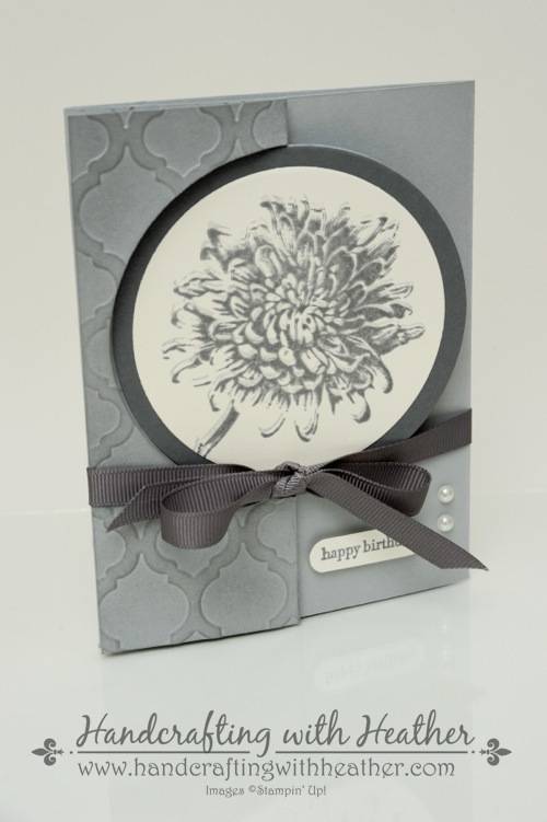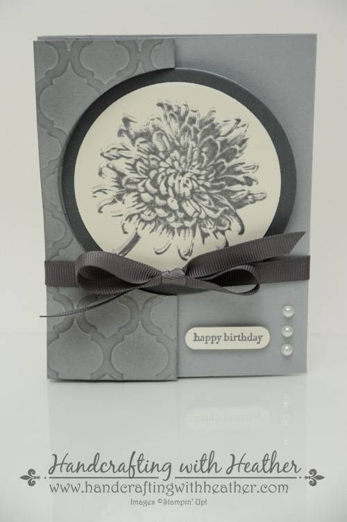 I love the flip card design, but I wanted to be able to write on the inside of my card without having it visible when the card was closed. Therefore, I extended the length of my card base to make a tri-fold style flip card. I began with a Smoky Slate card base (5-1/2″ x 11″) which I scored at 2-1/8″, 4-1/4″, and 8-1/2″. I followed the instructions in Brandy’s video tutorial to cut half of a circle on the front of my card using the the third largest Circle Framelits Die (counting from the outside in toward the middle). Then I dry embossed the front of my card using the Modern Mosaic textured impressions embossing folder and my Big Shot. Next, I folded back the front flap, created with my framelits, and used a sponge dauber to apply ink from my Smoky Slate Classic Stampin’ Pad to the left side of my card. I wanted to pick up the detail of the embossing and provide some contrast on the front of my card. I used a scrap piece of card stock to cover the parts of my card that I did not want affected.