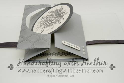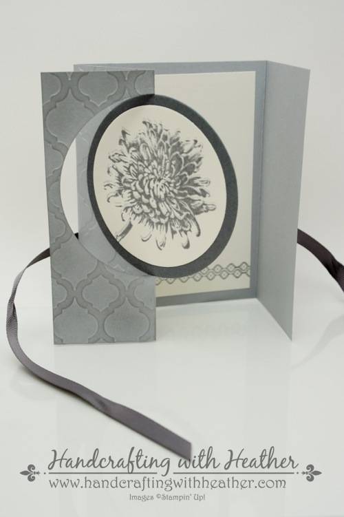 This card was really coming together nicely, but I didn’t like the fact that it didn’t lie flat, so I added some gray grosgrain ribbon to tie it closed… Now it was perfect! Finally, I finished the inside of my card by stamping one of the border stamps from the Mosaic Madness stamp set (wood mount and clear mount) along the bottom edge of a Very Vanilla card stock panel in Basic Gray ink.