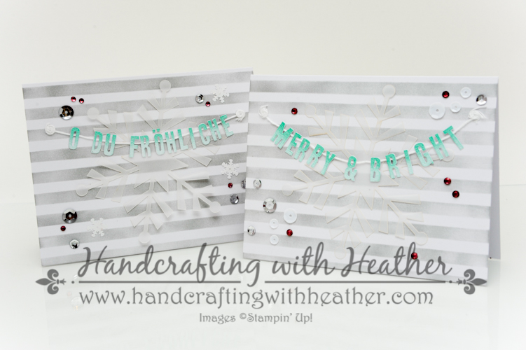 The card kit comes with the card bases and embellishments needed to make 20 cards, 5 of each of the four designs (stamps, ink, and adhesive not included).  However, we did decide to add a few extra embellishments for some extra wow!  We used rhinestones colored with the Cherry Cobbler Stampin’ Blendabilities and the Frosted Sequins for a little bling. 🙂