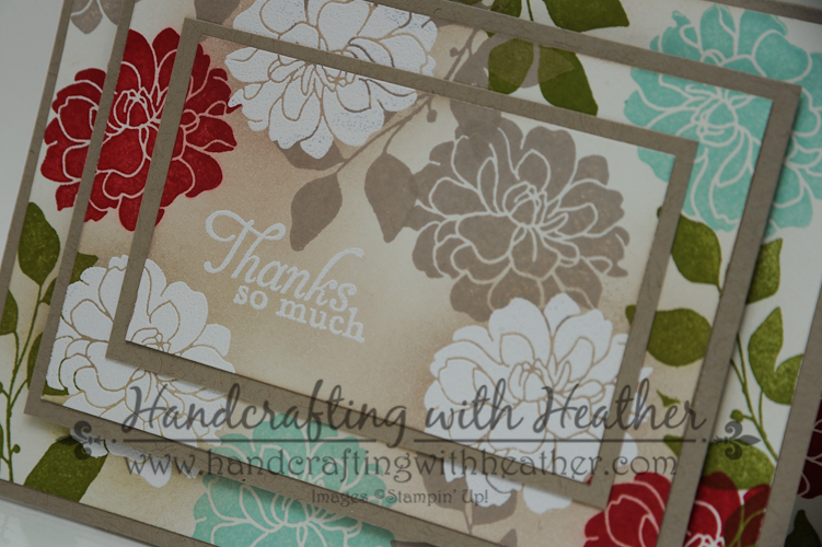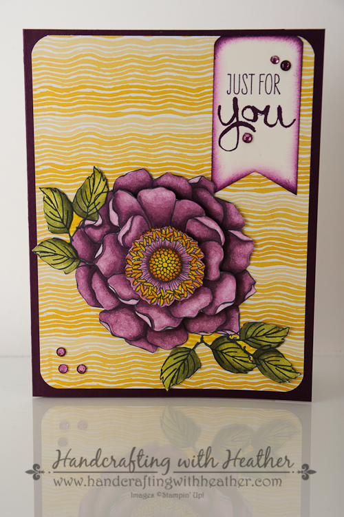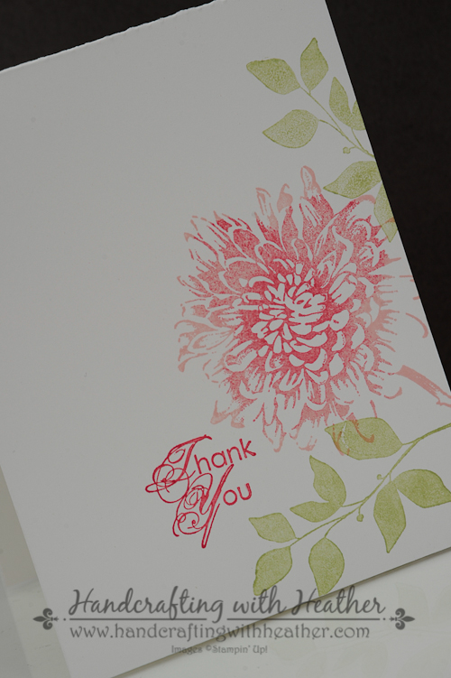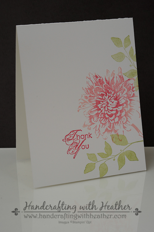 Now is a great time to be a Stampin’ Up! Demonstrator! I just got my pre-order in the mail, so today’s project is a sneak peek at the brand new Stampin’ Blendabilities Markers. These markers are a new line of product that will be introduced with the 2014 annual catalog on June 2nd. Unfortunately, there has been a delay for their initial release, so they will not be available for purchase right away, but I’m so excited about them that I wanted to show you what these beautiful markers can do anyway! I will keep you updated about exactly when they will be available. This project is full of sneak peeks for you. I used the Blended Bloom stamp because it cried out to me… “Heather, color me, please!” Isn’t it lovely? You are also getting a sneak peek at some of the brand new 2014-2015 In Colors and the Work of Art stamp set from Stampin! Up!