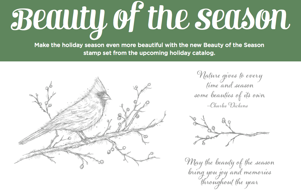 Christmas in July (or August)! Purchase the Beauty of the Season Stamp Set–now available as a special sneak peek of the 2014 holiday catalog! The new Holiday Catalog will arriving in my customer’s mailboxes very soon! But, you can order this beautiful stamp set in my online store now! Learn more.